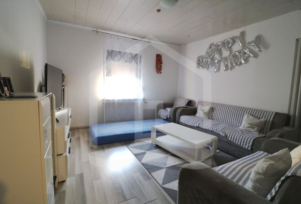 Die Erdgeschosswohnung mit ca. 56 m²und auf 2,5 Zimmer verteilt. Eine Wohnzimmer, 2 Schlafzimmer, ein großer Essbereich sowie eine offene Küche und ein sehr großes Badezimmer. Des Weiteren haben wir hier einen großen Abstellraum und Zugang zum Kellerraum, in dem die Zentralheizung steht. Die Zimmer sind mit Fliesen und Laminat ausgestattet.