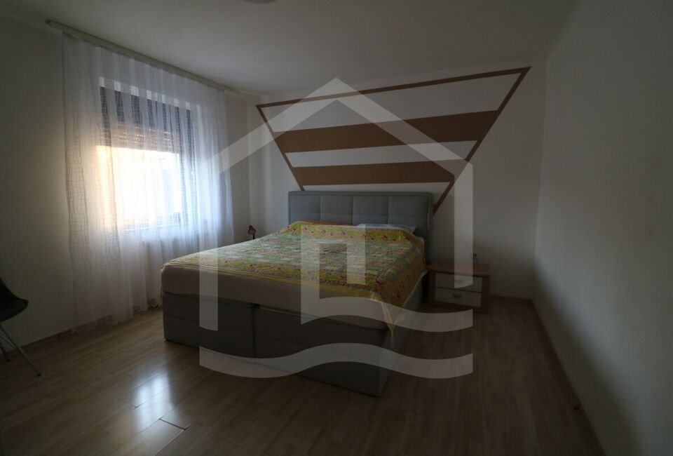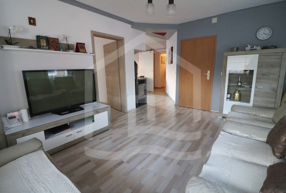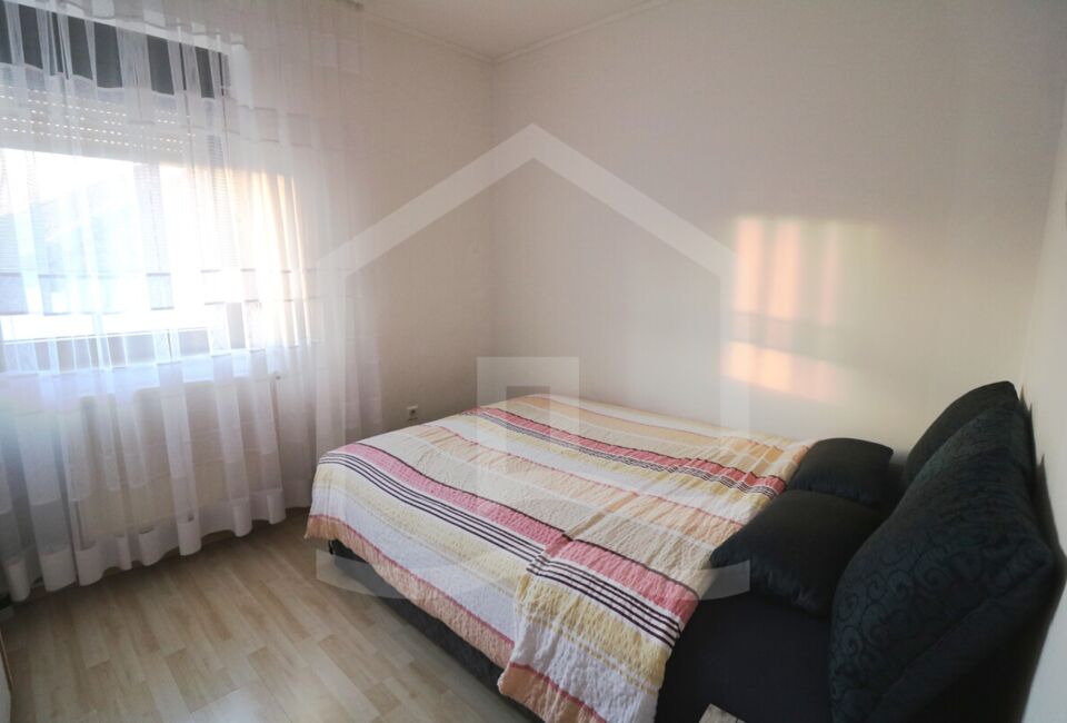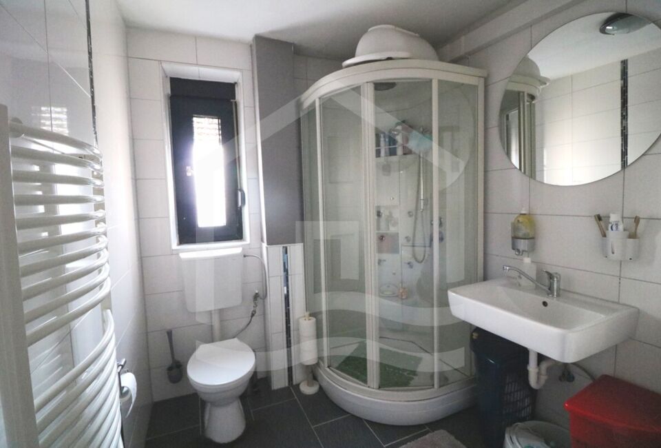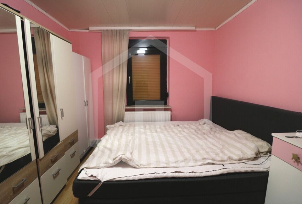 Die Erdgeschosswohnung mit ca. 56 m²und auf 2,5 Zimmer verteilt. Eine Wohnzimmer, 2 Schlafzimmer, ein großer Essbereich sowie eine offene Küche und ein sehr großes Badezimmer. Des Weiteren haben wir hier einen großen Abstellraum und Zugang zum Kellerraum, in dem die Zentralheizung steht. Die Zimmer sind mit Fliesen und Laminat ausgestattet.
