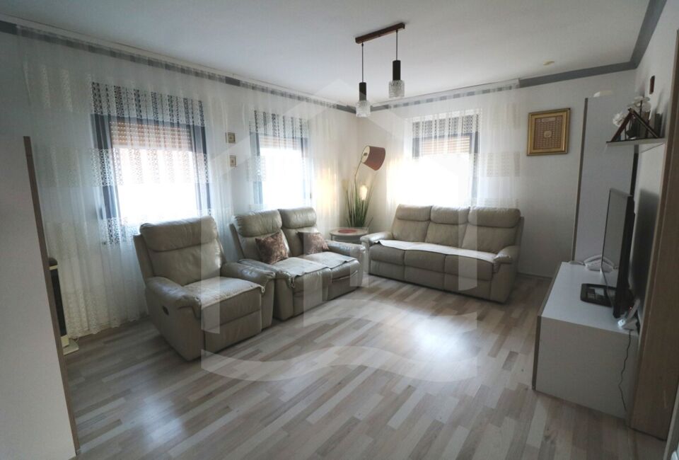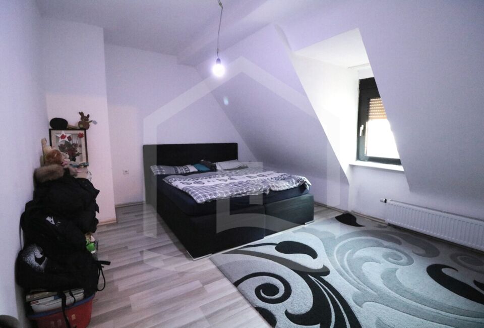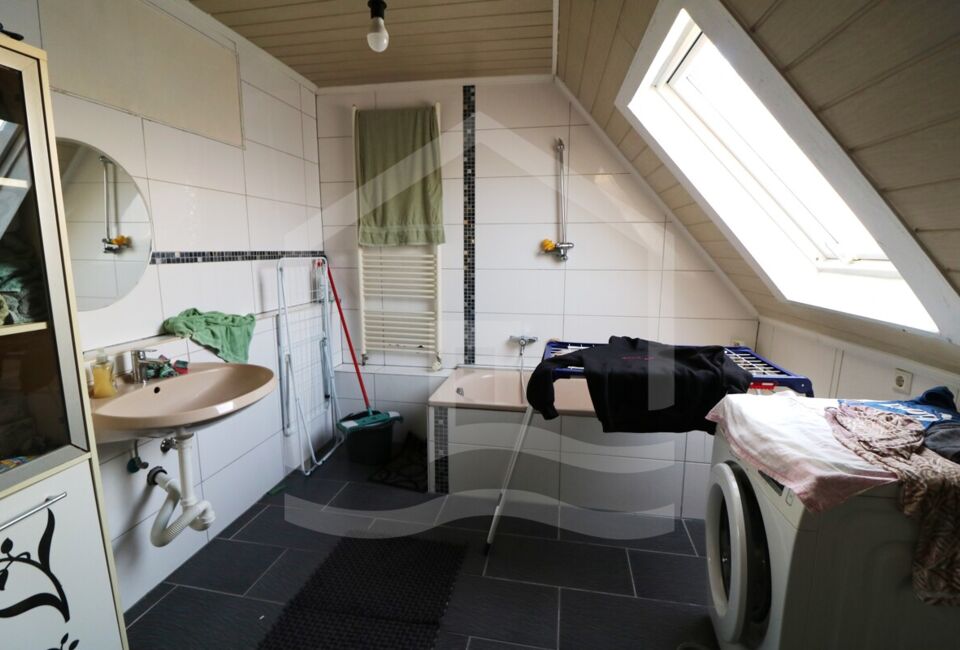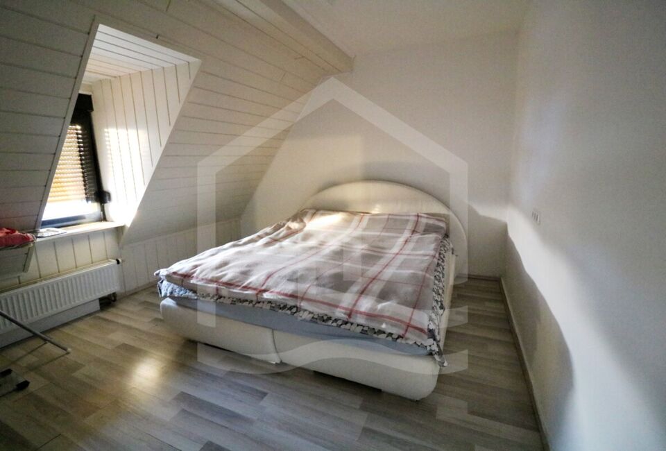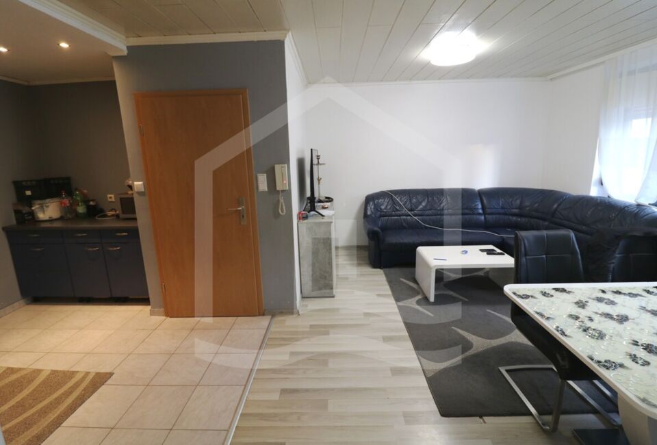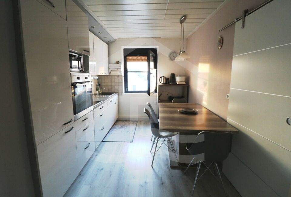 Die Obergeschosswohnung hat eine Wohnfläche von ca. 89 m². Hier haben wir ein Wohnzimmer, 3 Schlafzimmer ein große Küche. Ebenfalls ein großes Badezimmer mit separaten Gäste-WC und einen Ausgang auf die Terrasse, welche sich auf der komplett in 2022 erneuerten Garage sich befindet. Die Wohnung ist mit hochwertigen Vinyl ausgestattet.